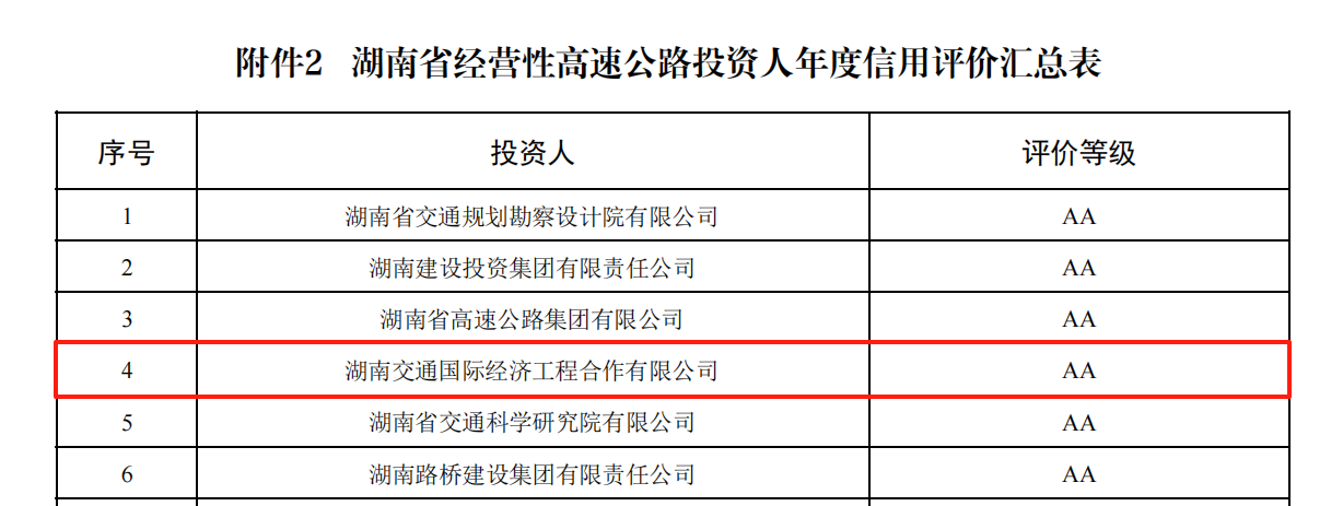 近日,在湖南省交通运输厅2024年度经营性高速公路投资人信用评价中,湖南建投交通国合公司以卓越实力脱颖而出,成功获评年度信用最高等级AA级荣誉。此次评价涵盖全省106家企业,仅7家获AA级认证,充分彰显了公司在行业中的标杆地位。