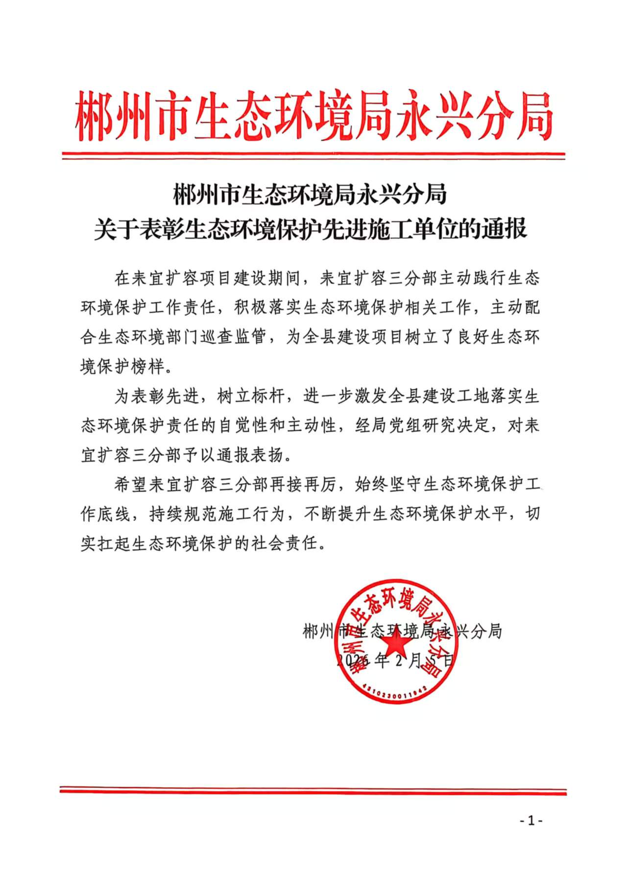 此次多部门联合表彰,既是对交通国合耒宜扩容6标项目规范管理和绿色施工成效的充分肯定,也体现了地方主管部门对项目依法建设、文明施工的高度认可。下一步,项目团队将以此为新起点,持续守牢安全生产、质量管控和生态环保底线,高标准推进工程建设任务落实,全力保障耒宜扩容项目高质量建成通车,为公司高质量发展和地方经济社会发展再立新功。
